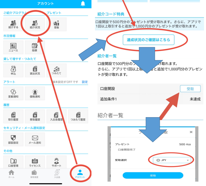 (アカウント→ご紹介プログラム→紹介状況→達成状況のご確認はこちら→jpyで1000受け取り)