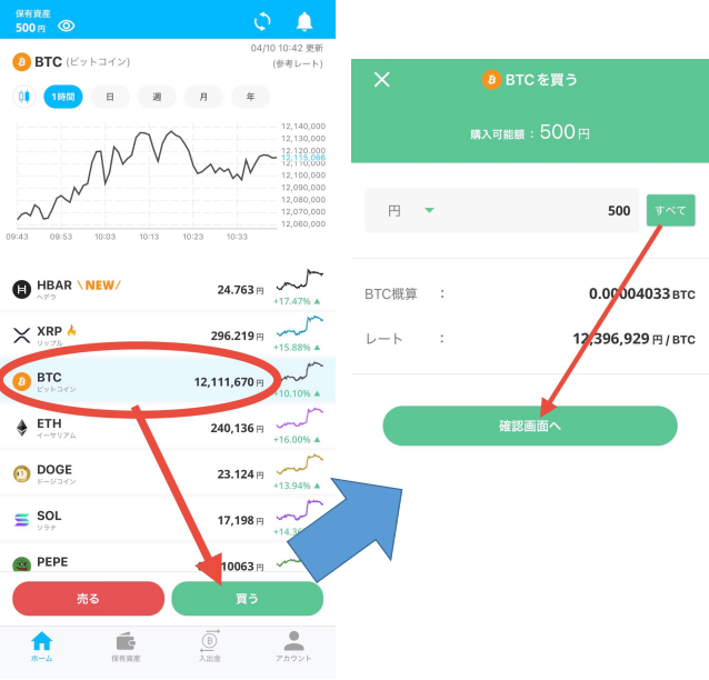・ビットコイン購入(販売所で500円分購入) 手順は以下画像を参考に