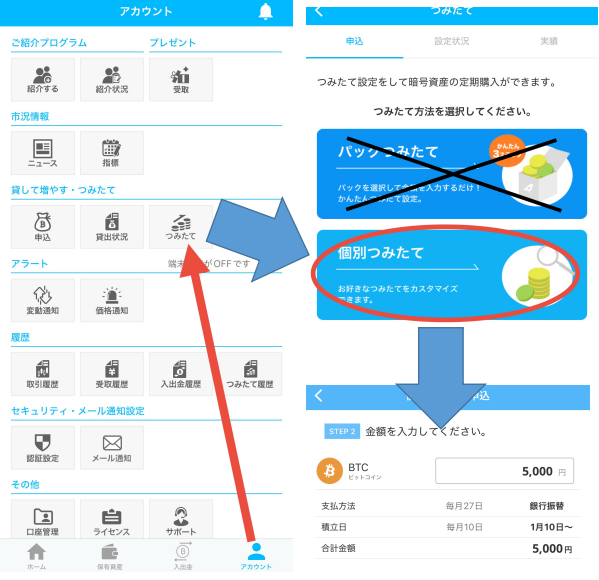 ・アプリ→アカウント→つみたて→個別つみたて→BTC 5000円で口座振替設定