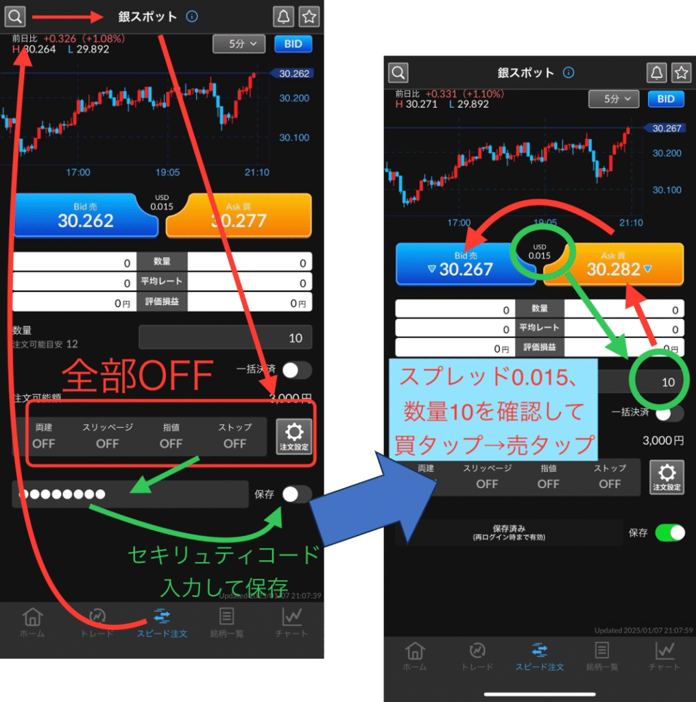 ①アプリ下のスピード注文タブ選択して左上の検索から銀スポットを選択、設定を全部OFFにして、セキュリティコード入力して保存