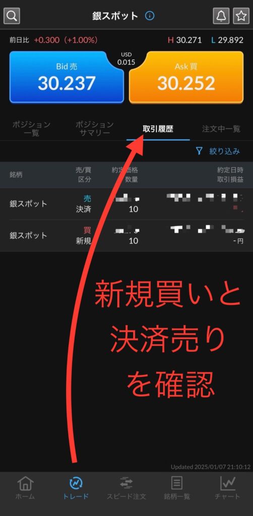トレードタブ→取引履歴で買いと売りを確認