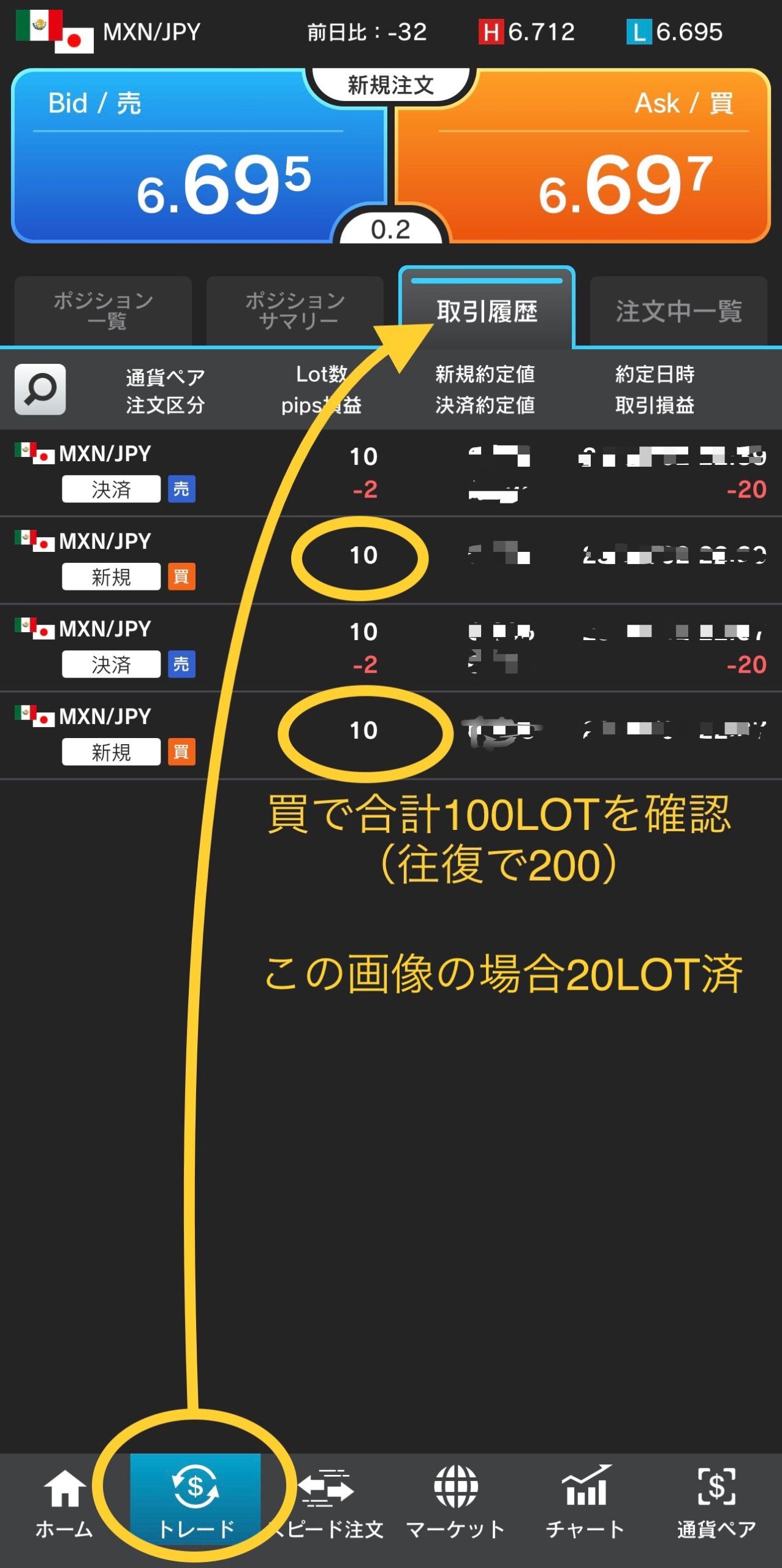 ↓この画像は練習で10LOT×2回取引したものです(実際は100LOTやります)