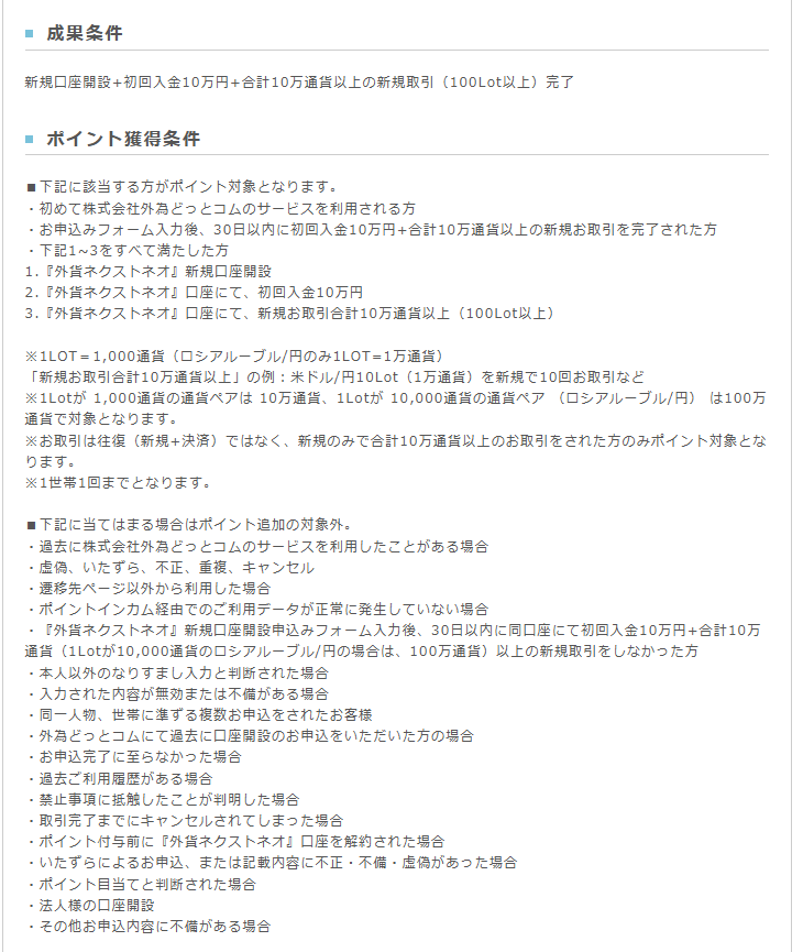 ポイントサイトの条件が①10万円入金10万通貨取引と②入金条件なしで100万通貨取引の2つがあります。