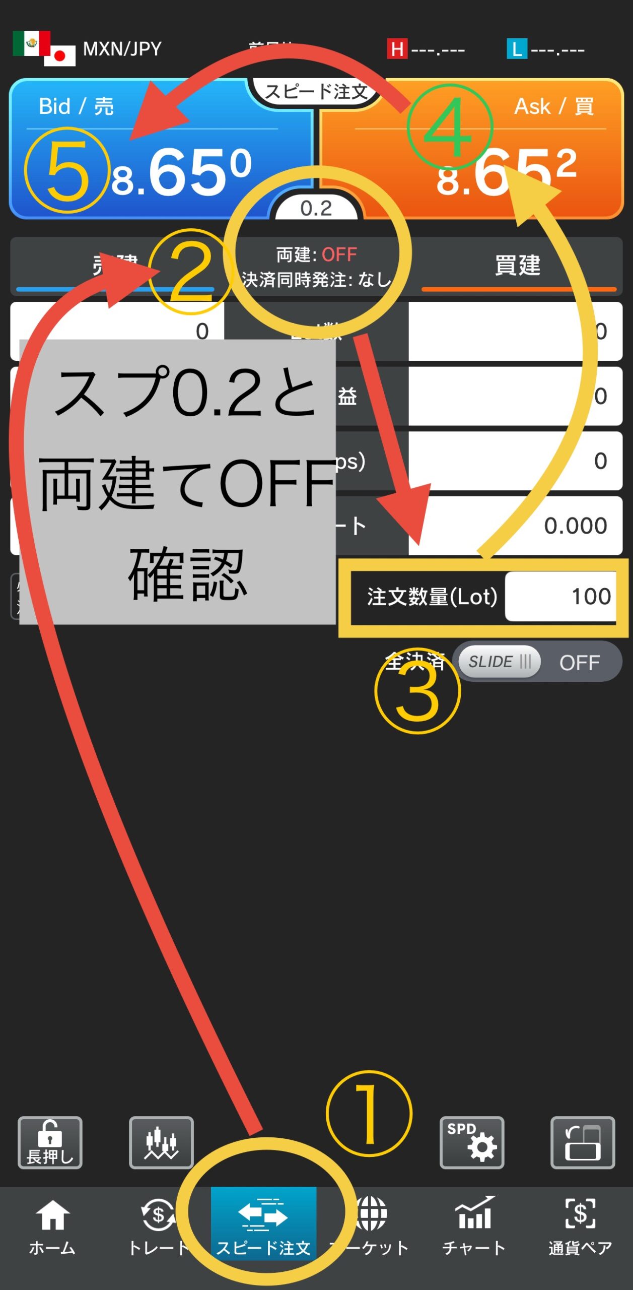 ・スピード注文タブ でスプレッド0.2(CP期間中は0.1)を確認(以下画像参照)