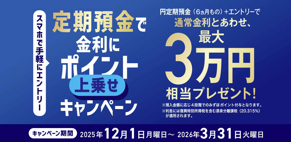 - 定期預金(6ヵ月もの)に預け入れで特典付与