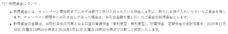 この二つの時点の残高が比較され、その増加分が今回の特典対象となります(入出金差額のような考え方です)。