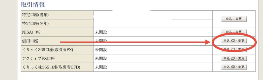 ログイン(証券総合取引口座)して【口座情報】-【お客さま情報】-【取引情報】から質問にお答え、信用取引口座開設を申込み。