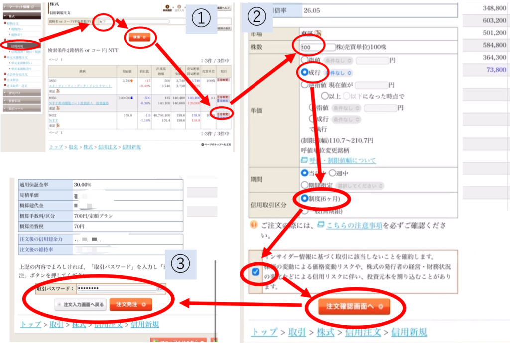 信用新規タップ→NTT検索して信用買タップ→100株、成行、制度、注文確認タップ→pass入力して発注