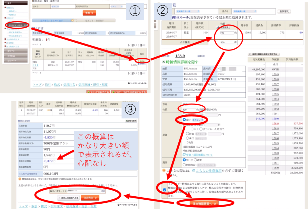信用返済・現引・現渡タップ→信返売タップ→100株、成行、注文確認タップ→pass入力して発注