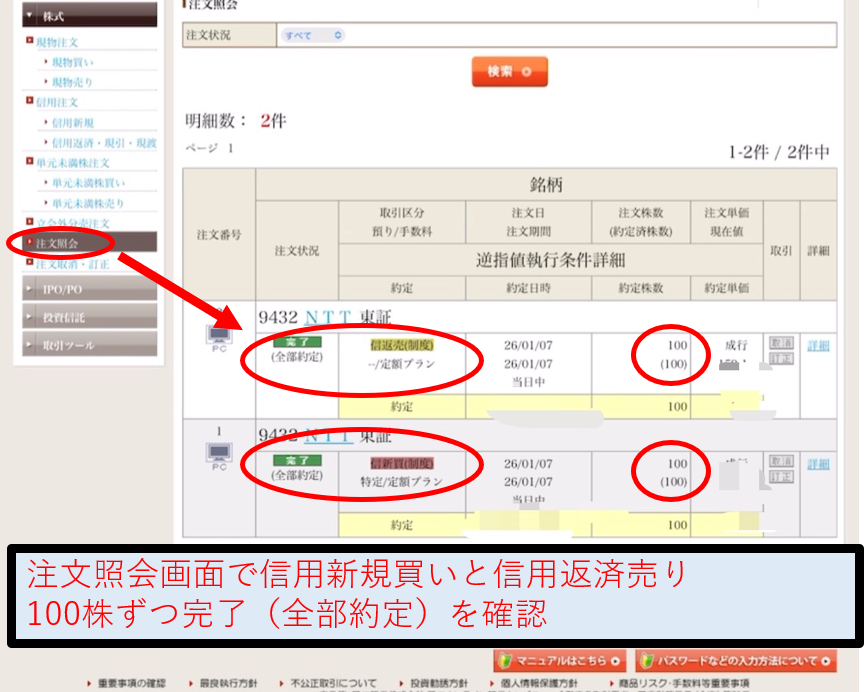 ↓注文照会タブから信用新規買いと信用返済売り100株ずつ完了(全部約定)を確認