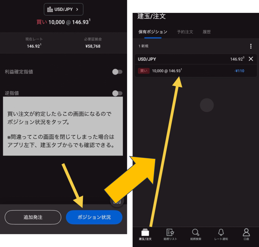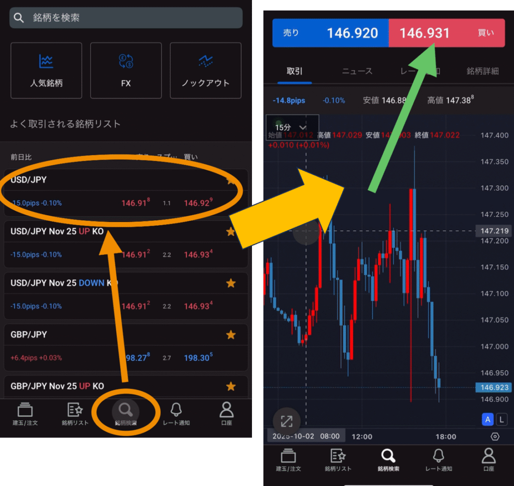 ①アプリの銘柄検索タブからUSD / JPYを選択して買いをタップ