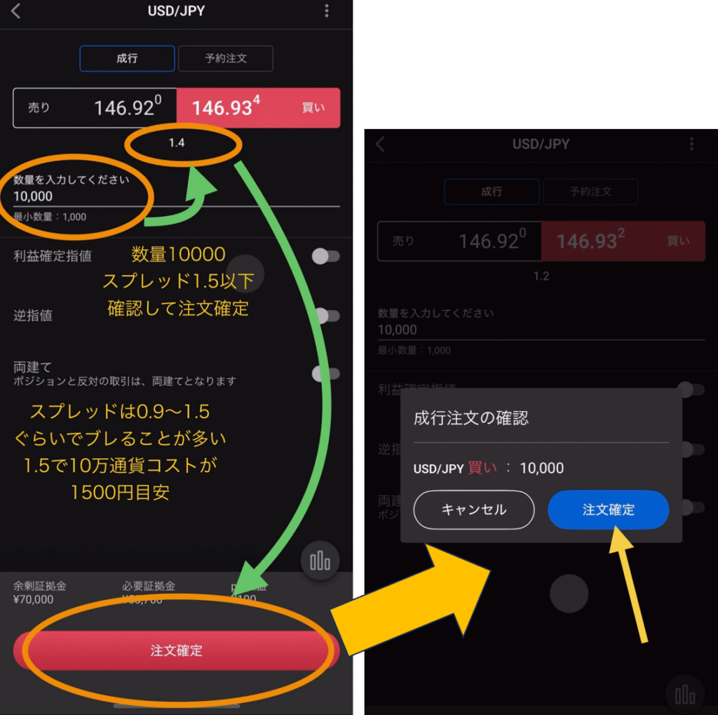 ②数量10000、スプレッド1.5以下を確認して注文確定→次の画面で再度注文確定