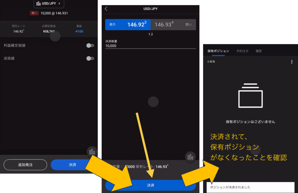 ⑤決済タップ→再度決済タップ ⑥保有ポジションがなくなったことを確認